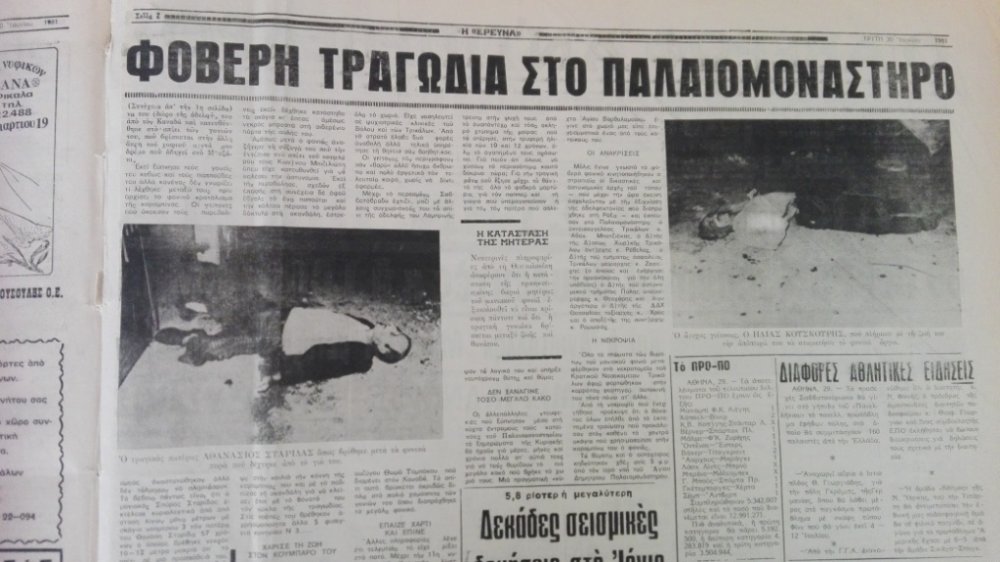 «Ήταν 10.30 το βράδυ της Κυριακής 28 Ιουνίου 1981. Το Παλαιομονάστηρο Τρικάλων ήταν ένα μικρό, ωραίο και ήσυχο χωριό. Οι κάτοικοί του ασχολούνταν με τις αγροτικές και τις κτηνοτροφικές εργασίες τους και ήταν αγαπημένοι με τους συγγενείς και τους γείτονές τους. Αυτή τη γαλήνη που βασίλευε στο χωριό τάραξε η φοβερή τραγωδία που διαδραματίστηκε. Πρωταγωνιστής ήταν ο Σπύρος Σταρίδας 48 χρόνων, γεωργός, ο οποίος, σύμφωνα με τους συγχωριανούς του, αντιμετώπιζε σοβαρά ψυχολογικά προβλήματα. Τον τελευταίο καιρό δεν έπαιρνε τα χάπια του και είχε αρχίσει να πίνει. Ένα βράδυ χωρίς καμία προειδοποίηση ή άλλο σημάδι, εντελώς αναπάντεχα, άρπαξε μια καραμπίνα και άρχισε να σκοτώνει συγγενικά του πρόσωπα και όποιον άλλον είχε την ατυχία να βρεθεί στον δρόμο του. Σύμφωνα με τα στοιχεία του ρεπορτάζ: Ο Σταρίδας πρώτα πυροβόλησε και σκότωσε τον πατέρα του. Στη συνέχεια πυροβόλησε τον παππού και τη γιαγιά του και τέλος τη μάνα του. Στη συνέχεια, περπατώντας με την καραμπίνα στο χέρι, συνάντησε στον δρόμο τη θεία και τον θείο του. Τους σκότωσε. Πιο πέρα, συνάντησε ένα γείτονα, που είχε κι αυτός την ίδια τύχη με τους άλλους. Τελευταία σκότωσε τη γυναίκα του, οπότε και αυτοκτόνησε, κλείνοντας έτσι τον φοβερό κύκλο του αίματος.