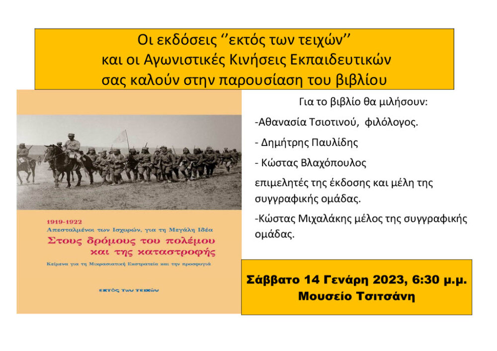 Οι Αγωνιστικές Κινήσεις Εκπαιδευτικών και οι εκδόσεις “Εκτός των Τειχών” παρουσιάζουν το Σάββατο 14 Ιανουαρίου στις 6:30μμ στο μουσείο Τσιτσάνη στα Τρίκαλα το βιβλίο: