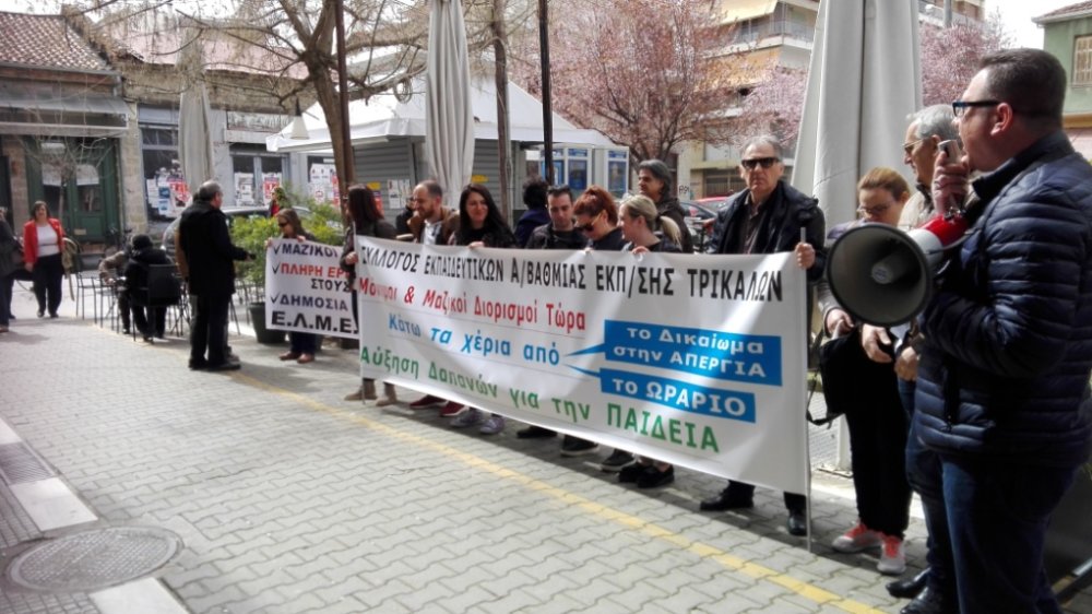 Συγκέντρωση διαμαρτυρία κάτω από τα γραφεία της Δευτεροβάθμιας Εκπαίδευσης Τρικάλων πραγματοποίησε το μεσημέρι ο Σύλλογος Δασκάλων και Νηπιαγωγών που ύψωσαν πανό διαμαρτυρίας φωνάζοντας συνθήματα για την δικαίωση των αιτημάτων τους.