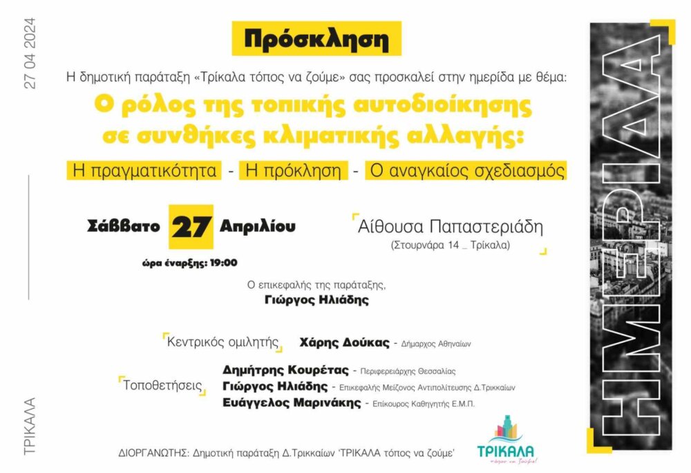 Ημερίδα για την Τοπική Αυτοδιοίκηση διοργανώνει η παράταξη «Τρίκαλα, Τόπος να ζούμε», το Σάββατο 27 Απριλίου, στις 7 το απόγευμα, στο κτήριο «Παπαστεριάδη» (Στουρνάρα 14).