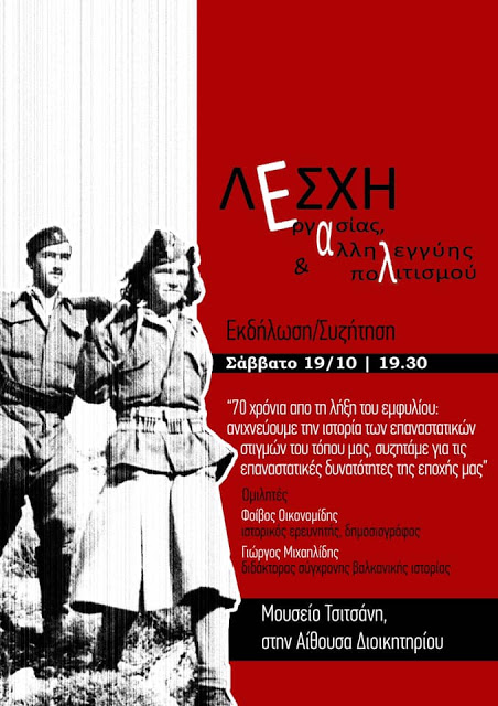 Με αφορμή τη συμπλήρωση 70 χρόνων από τη λήξη του εμφυλίου πολέμου η Λέσχη Εργασίας, Αλληλεγγύης & Πολιτισμού διοργανώνει το Σάββατο 19 Οκτώβρη στις 7:30 μ.μ., στην Αίθουσα Διοικητηρίου του Μουσείου Τσιτσάνη, εκδήλωση- συζήτηση με θέμα: «70 χρόνια από τη λήξη του εμφυλίου: ανιχνεύουμε την ιστορία των επαναστατικών στιγμών του τόπου μας, συζητάμε για τις επαναστατικές δυνατότητες της εποχής μας».