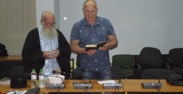 Αυτή τη φορά δεν απευθύνθηκε σε ιερέα του Δήμου Φαρκαδόνας, αλλά σε ιερέα των ΓΟΧ, ο οποίος αφίχθη στην αίθουσα από το γειτονικό νομό της Λάρισας, πλαισιωμένος από το δημοτικό σύμβουλο της αντιπολίτευσης. Ο ηλικιωμένος ιερέας τέλεσε τον Αγιασμό με ευχές υπέρ Ειρήνης, ίασης ιαμάτων πάσης επιβουλής κακού και καυγάδων.