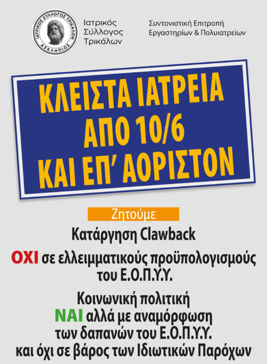 Ο Ιατρικός Σύλλογος Τρικάλων στηρίζει την κινητοποίηση των Ιατρών Μικροβιολόγων και ζητά την κατανόηση των ασφαλισμένων για την ταλαιπωρία που θα υποστούν.
