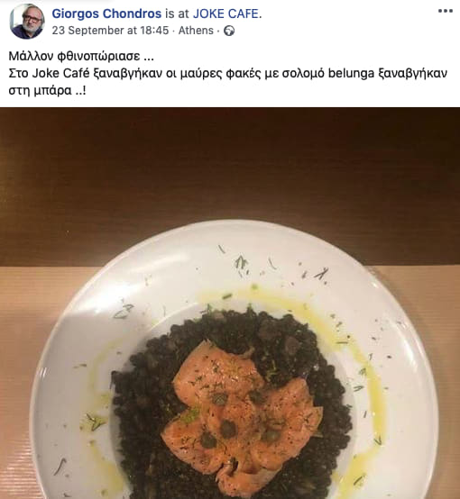 Μάλλον φθινοπώριασε … Στο Joke Café ξαναβγήκαν οι μαύρες φακές με σολομό belunga ξαναβγήκαν στη μπάρα ..!… Αυτή η ανάρτηση του Γιώργου Χονδρού στο facebook ξεσήκωσε την Ρένα Δούρου με αποτέλεσμα τον παρακάτω απολαυστικό διάλογο: