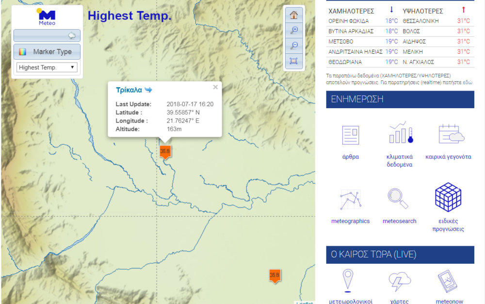 Πλησίασε τους 38 βαθμούς Κελσίου η μέγιστη θερμοκρασία τη Δευτέρα 16 Ιουλίου 2018. Σύμφωνα με το δίκτυο αυτόματων μετεωρολογικών σταθμών του Εθνικού Αστεροσκοπείου Αθηνών οι υψηλότερες μέγιστες καταγράφηκαν στο Πετροκεφάλι Μοιρών (37.7), στη Γαβαλού Αιτωλοακαρνανίας (37.2), στα Τρίκαλα (37.2), στη Καλαμπάκα (36.6), στη Λάρισα (36.6), και στη Λειβαδιά (36.6).