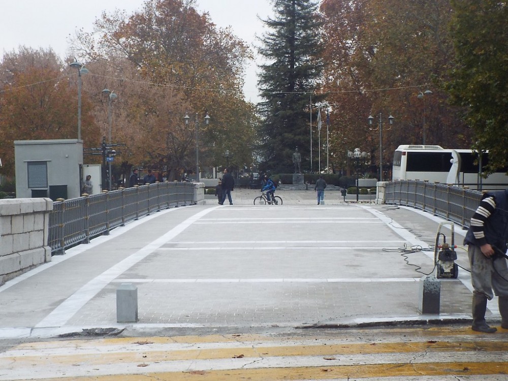 – Μετά τον λεπτομερή καθαρισμό της πλάκας της γέφυρας, έγινε επίστρωση με κυβόλιθο διαστάσεων 0,10μ.Χ0,20μ., πάχους 3εκ. αποχρώσεων του γκρι, σε συνδυασμό με ταινίες σκληρού λευκού μαρμάρου πλάτους 0,30μ. πάχους 3 εκ και ορθογωνισμένης πέτρας διαστάσεων 0,30μΧ1,00μ. κατάλληλου χρώματος.Η επιφάνεια όλων των υλικών επίστρωσης είναι αδροποιημένη προκειμένου να αποφευχθεί η ολισθηρότητα του δαπέδου – Εγινε αμμοβολή των σιδηρών κιγκλιδωμάτων της γέφυρας προκειμένου να αφαιρεθεί το παλαιό χρώμα και τα τυχόν υπολείμματα σκουριάς, ενώ βάφτηκε με αντισκωριακή βαφή χρώματος γκρι σκούρο μεταλλικού.