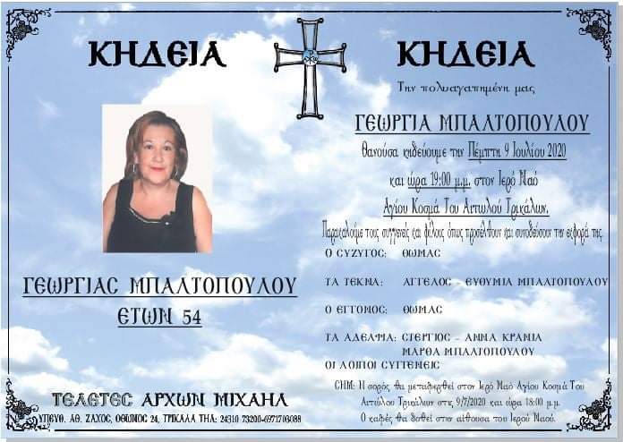 Απεβίωσε στα 54 της χρόνια η Γεωργία Μπαλτοπούλου. Κηδεύεται την Πέμπτη στις 7 μ.μ. εκ του Ι.Ν. Αγίου Κοσμά του Αιτωλού. Αφήνει πίσω το σύζυγό της Θωμά, τα παιδιά της Άγγελο-Ευθυμία Μπαλτοπούλου, αδέλφια και λοιπούς συγγενείς.