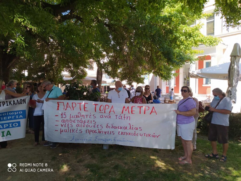 Κινητοποίηση έξω από την Πρωτοβάθμια και Δευτεροβάθμια Διεύθυνση Εκπαίδευσης, στα Τρίκαλα, πραγματοποίησαν σήμερα Παρασκευή 28/8 καθηγητές, δάσκαλοι, αναπληρωτές απαιτώντας ουσιαστικά μέτρα προστασίας της υγείας μαθητών και εκπαιδευτικών, ώστε να είναι ασφαλές το αναγκαίο άνοιγμα των σχολείων το Σεπτέμβρη.