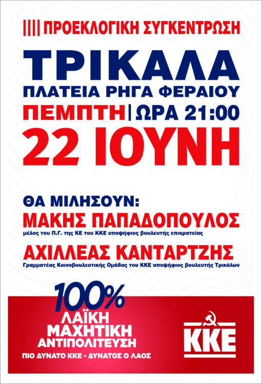 Η Κεντρική Προεκλογική Συγκέντρωση του ΚΚΕ στα Τρίκαλα , θα πραγματοποιηθεί την Πέμπτη 22 Ιούνη , στην αρχή της Ασκληπιού ( πλατεία Ρήγα Φεραίου)  στις 9μμ.