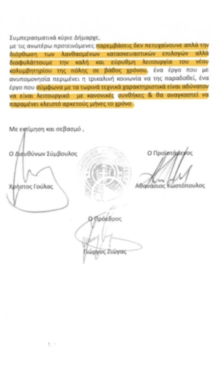 Σε γενικές γραμμές σύμφωνα με την επιστολή του Ζιώγα η σκεπή του κολυμβητηρίου είναι ακατάλληλη αφού προκαλεί υπερθέρμανση του χώρου… και χρήζει αλλαγής…