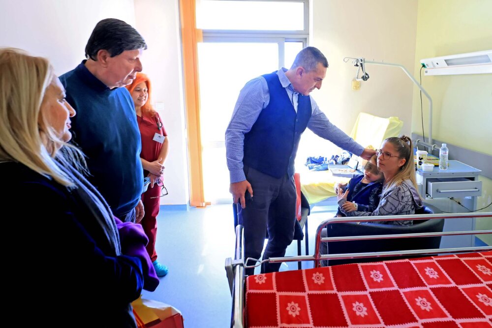 Στην Παιδιατρική Κλινική του Γενικού Νοσοκομείου, συνοδευόμενος από την Αντιπεριφερειάρχη  Τρικάλων  Χρύσα Ντιντή , μοίρασε δώρα στα παιδιά που νοσηλεύονται, δίνοντάς τους λίγη χαρά στις δύσκολες στιγμές της νοσηλείας τους. Στη συνέχεια, συναντήθηκε με τη διοίκηση και το ιατρικό και νοσηλευτικό προσωπικό του νοσοκομείου, υπογραμμίζοντας για ακόμη μια φορά τη σημασία της ενίσχυσης του τομέα της υγείας.