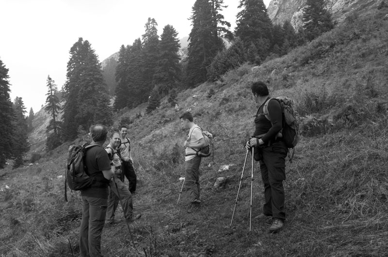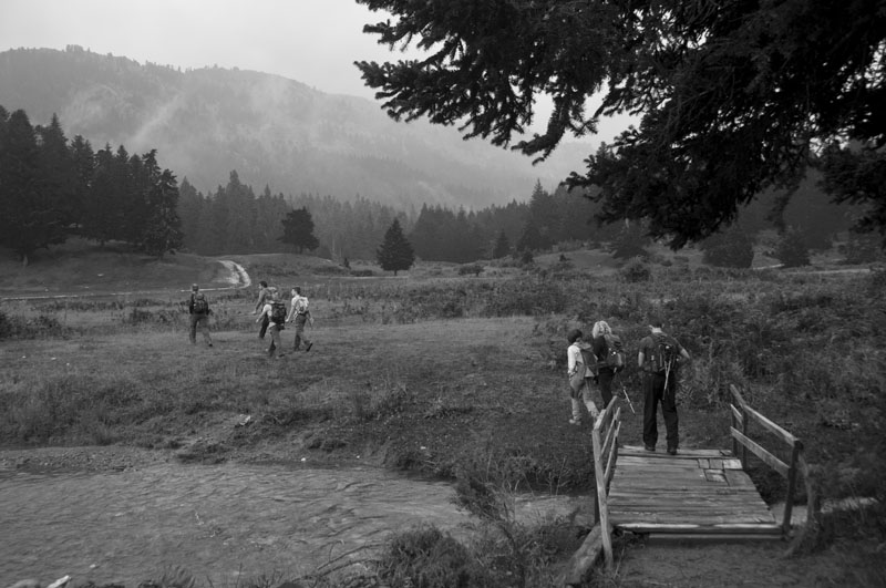Τα ρέματα που γέννησαν οι τελευταίες βροχές οργώνουν την πλάτη του βουνού γεμίζοντας λάσπες το μονοπάτι. Στον ίσκιο των ελάτων πλήθος τα μανιτάρια, αφορμή για φωτογραφίες και συζητήσεις για το είδος και την εδωδιμότητά τους.