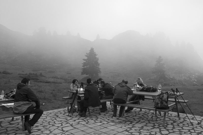 Μετά από δίωρη πεζοπορία φτάσαμε στο καταφύγιο στο οποίο γίνονται εργασίες ενόψει της χειμερινής περιόδου. Οι γύρω κορυφές τυλιγμένες στην ομίχλη, αποθαρρύνουν την ανάβαση, αλλά καθόλου δεν στενοχωρηθήκαμε. Είπαμε, μια βόλτα ήταν αυτή, έτσι για να ξεμουδιάσουμε, να μη χαραμίσουμε την Κυριακή μας στην καθημερινότητα της πόλης.