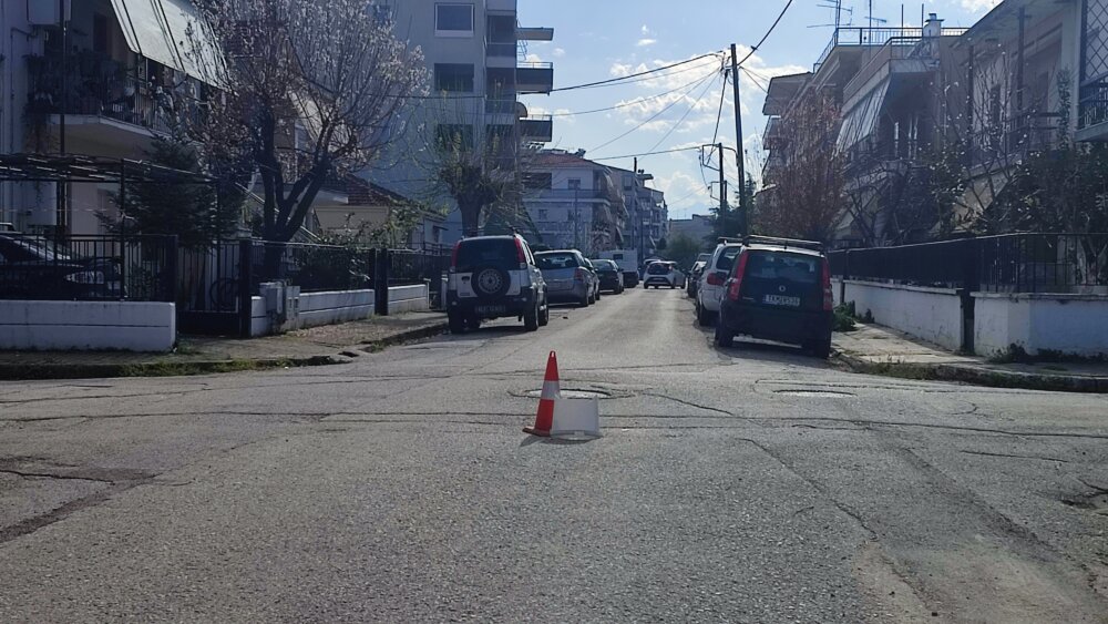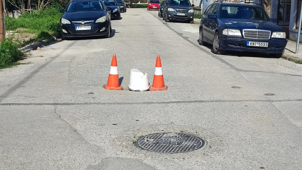 Η φωτογραφία είναι στην οδό Ισχομάχου όπου καταμεσής του οδοστρώματος έχει ανοίξει μια τρύπα… (Μάλλον της ΔΕΥΑΤ), όπου κάποιος κάτοικος της περιοχής τοποθέτησε έναν κουβά για μην πέσει κανείς μέσα (δίπλα υπάρχει σχολείο).