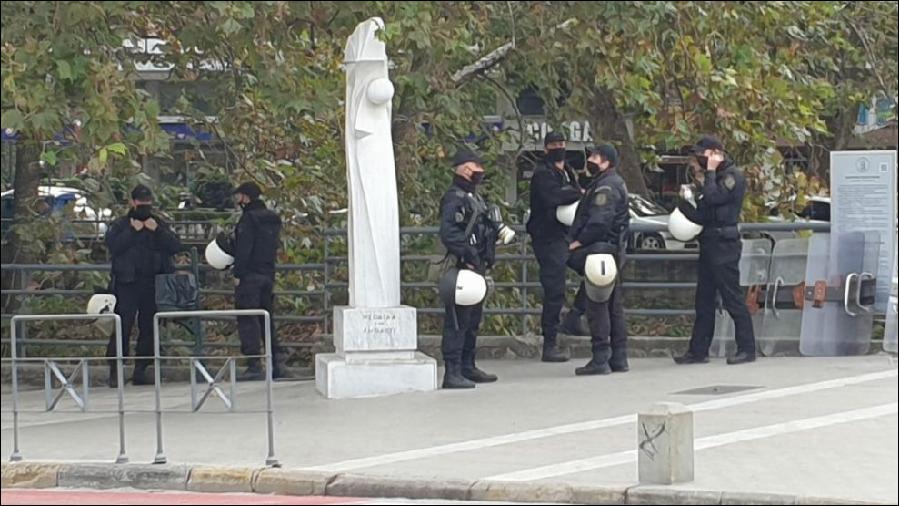 Εικόνα 2η: Τρίκαλα 17/11/2020. Μετά από ανακοίνωση πολιτικών και κοινωνικών φορέων για τον εορτασμό του Πολυτεχνείου, γίνονται δύο συγκεντρώσεις στην κεντρική πλατεία και στην πλατεία Ρήγα Φεραίου, και σε καθεμία από αυτές πηγαίνουν 20 με 30 άτομα περίπου. Όλη την ημέρα και σε όλο το κέντρο της πόλης βρίσκονται δεκάδες αστυνομικοί, «για λόγους προστασίας της δημόσιας υγείας και μόνο…» από τον συγχρωτισμό, εξαιτίας της πανδημίας.