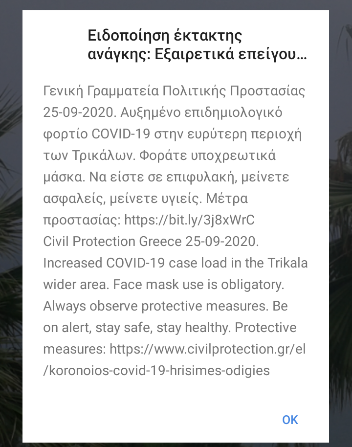 Το κινητό τους να χτυπά για άλλη μια φορά με μήνυμα από το 112 της Πολιτικής Προστασίας, είδαν οι Τρικαλινοί… που πλέον από αύριο πρέπει να φορούν μάσκα όπου πάνε… ακόμη και στον… ύπνο τους.