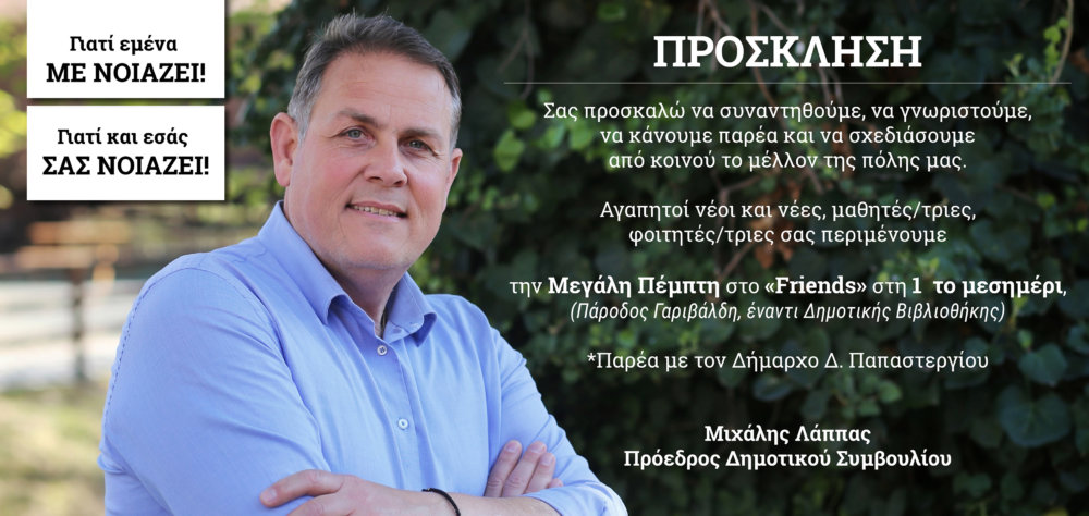 Ραντεβού με την τρικαλινή νεολαία για τον συνδυασμό Επανεκκίνηση 2, δίνει ο προέδρος του Δημοτικού Συμβουλίου και εκ νέου υποψηφίου Μιχάλης Λάππας.