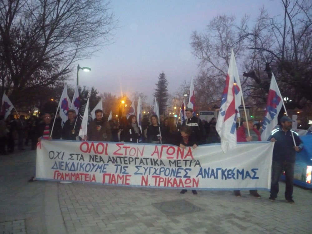 Συλλαλητήριο ενάντια στα νέα μέτρα που πραγματοποίησε σήμερα η Γραμματεία Τρικάλων του ΠΑΜΕ στα Τρίκαλα όπου μεταξύ άλλων τονίστηκε πως: «Τα νέα αντιλαϊκά μέτρα που ετοιμάζουν κυβέρνηση, ΕΕ και ΔΝΤ θα έρθουν να προστεθούν σε αυτά που ήδη εφαρμόζονται και έχουν οδηγήσει στη φτώχεια και την εξαθλίωση εργαζόμενους και συνταξιούχους, πρόκειται για μέτρα που ξεζουμίζουν τον εργαζόμενο λαό για να ταΐζουν τα μονοπώλια και τους καπιταλιστές». Η κινητοποίηση έγινε στην πλατεία Ρήγα Φεραίου, με τα μέλη του ΠΑΜΕ να τονίζουν ότι «απέναντι στην προκλητική προσπάθεια της κυβέρνησης και διαφόρων επιτελείων να μας πείσουν ότι πρέπει να… πανηγυρίζουμε για το «ξεμπλοκάρισμα» των αντιλαϊκών παζαριών για την «αξιολόγηση», με τη συμφωνία για άμεση νομοθέτηση ενός πρόσθετου πακέτου μόνιμων αντιλαϊκών μέτρων για μετά το 2018».