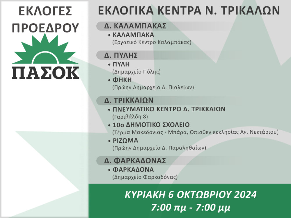 Τα εκλογικά κέντρα που θα ψηφίσουν για αρχηγό του ΠΑΣΟΚ στα Τρίκαλα