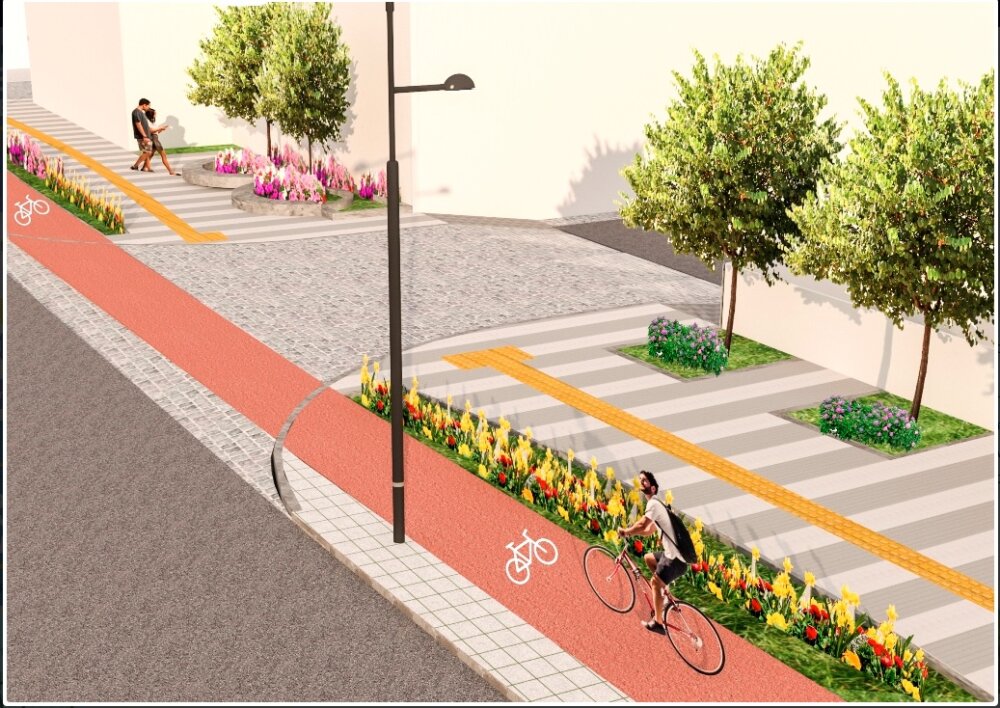Εκατέρωθεν και κατά μήκος της οδού θα είναι εγκιβωτισμένος στην στάθμη του πεζοδρομίου, ο ποδηλατόδρομος σταθερού πλάτους 1,50μ. μονής κατεύθυνσης, κατά την φορά των αυτοκινήτων με τελική επίστρωση έγχρωμου-κόκκινου βιομηχανικού δαπέδου, μετά της απαιτουμένης υπόβασης από οπλισμένο σκυρόδεμα, αφού πρώτα προηγηθεί η κατασκευή πλακοστρωμένης ζώνης συνολικού πλάτους 0,70μ. για την ασφάλεια του ποδηλάτη. Η ζώνη πρασίνου θα αναπτυχθεί μεταξύ του ποδηλατοδρόμου και του πεζοδρομίου μεταβλητού πλάτους 0,60-2,00μ. ανάλογα με το πλάτος του πεζοδρομίου. Τα πεζοδρόμια εκατέρωθεν, μεταβλητού πλάτους 2-3μ. κατασκευάζονται με έγχρωμες αντιολισθητικές πλάκες πεζοδρομίου. Στα σημεία διασταύρωσης κατασκευάζονται ανισόπεδες διαβάσεις με τελική επίστρωση κυβόλιθου, ενώ στα σημεία όπου απαιτείται διαμορφώνονται ράμπες κλίσης 5% για την εξυπηρέτηση των ΑμεΑ . Επιπλέον σε θέσεις με έντονη υψομετρική διαφορά κατασκευάζονται τοίχοι αντιστήριξης για την προσαρμογή της στάθμης του πεζοδρομίου. Η λειτουργικότητας της παρέμβασης ολοκληρώνεται με τις απαραίτητες Η/Μ εργασίες για τη δημιουργία νέου δικτύου ηλεκτροφωτισμού.