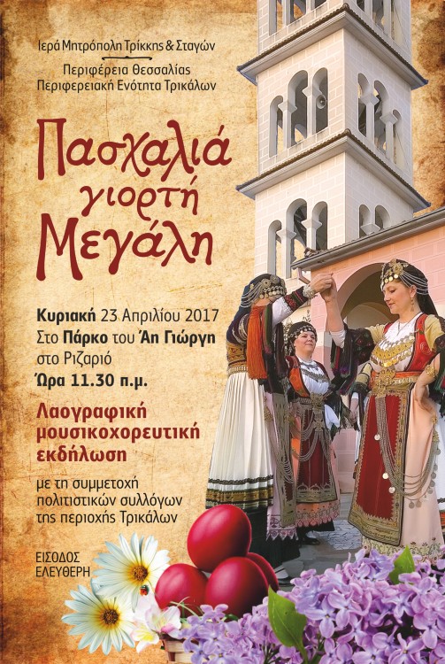 Η Περιφερειακή Ενότητα Τρικάλων της Περιφέρειας Θεσσαλίας και η Ιερά Μητρόπολη Τρίκκης & Σταγών πραγματοποιούν αυτή την Κυριακή (του Θωμά), 23 Απριλίου 2017, την αναβληθείσα εκδήλωση με τίτλο «Πασχαλιά Γιορτή Μεγάλη». Η εκδήλωση θα γίνει στο πάρκο Αγίου Γεωργίου Ριζαριού, στον αύλειο χώρο του Ι.Ν. Αγίου Γεωργίου, στις 11:30 π.μ. μετά τη Θεία Λειτουργία.