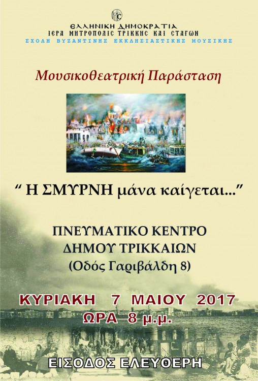 Στην εκδήλωση αυτή, που οργανώνει η Σχολή Βυζαντινής Μουσικής της Ιεράς μας Μητροπόλεως Τρίκκης και Σταγών το απόγευμα της Κυριακής 7 Μαΐου και ώρα 8, θα ακουστούν τραγούδια για την αλησμόνητη Σμύρνη και την καταστροφή της από τους Τούρκους το 1922. Τα τραγούδια είναι του συμπολίτη μας Αποστόλου Καλδάρα σε ποίηση Πυθαγόρα, του Παντελή Θαλασσινού τα ”Τα Σμυρνέικα τραγούδια” καθώς και μελοποιημένα ποιήματα του Κωνσταντίνου Γεωργουσόπουλου, όπως το ”ανεβαίνει ψηλά στον ουράνιο τρούλο ο δικέφαλος γυπαετός”.