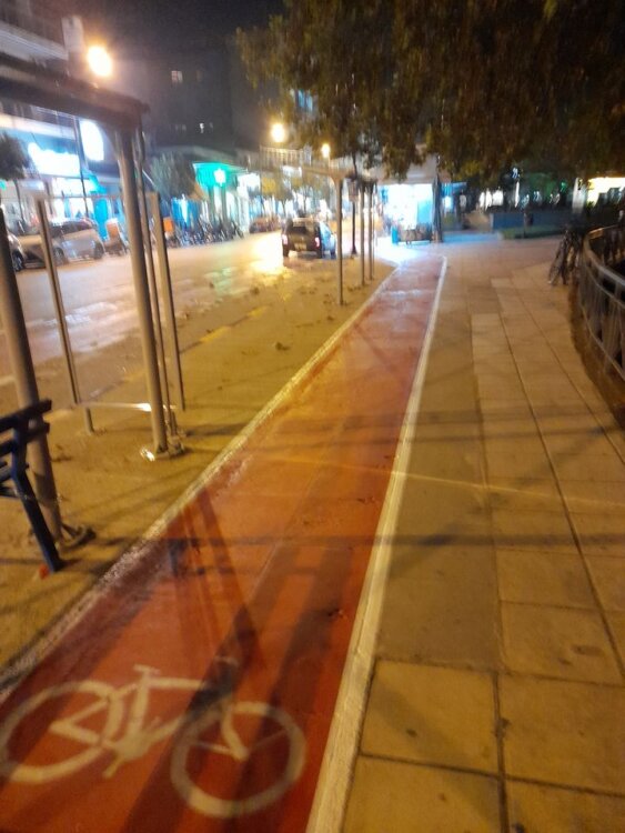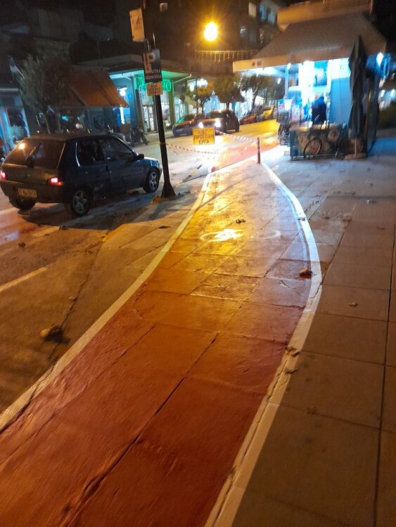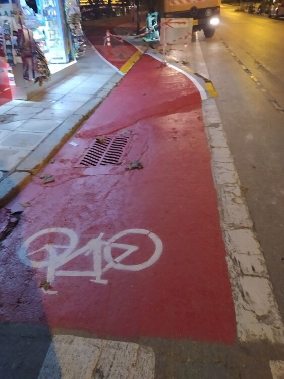 Πέραν όμως της αστείας πλευράς, το συγκεκριμένο τμήμα του ποδηλάτου δρόμου (άγνωστο ποιος φαεινός εγκέφαλος του δήμου είχε αυτήν την ιδέα) είναι άκρως επικίνδυνο μιας και περνά πάνω από σχάρες φρεατίων, σκαρφαλώνει σε πεζοδρόμια, περνά πίσω αποστάσεις πεζών για να καταλήξει ξανά στον επίσης απλά μπογιατισμένο ποδηλατόδρομο.