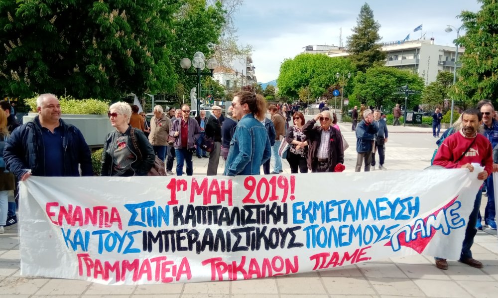 Λίγο πιο κάτω στην Κεντρική Πλατεία, δειλά – δειλά αρκετά πριν τις 10 που ήταν η ώρα συγκέντρωσης έφτασαν οι πρώτοι -μεγαλύτερης ηλικίας- διαδηλωτές με το κόκκινο λουλούδι (τριαντάφυλλο κυρίως) και άρχισαν να ξετυλίγουν τα πανό: « 1η Μάη Ενάντια στην καπιταλιστική εκμετάλλευση και τους ιμπεριαλιστικούς πολέμους. Γραμματεία Τρικάλων ΠΑΜΕ» – «Η ανάπτυξή τους χτίζεται πάνω στα δικά μας συντρίμμια. Μπες μπροστά μην μένεις θεατής ΠΑΣΕΒΕ». Σε λίγο άρχισαν να καταφτάνουν και οι νεότεροι και νεότερες με τα δικά τους πανό: «Γυναίκα βγες μπροστά στον αγώνα για μια ζωή χωρίς εκμετάλλευση» και θέλουμε σχολείο να μορφώνει»…