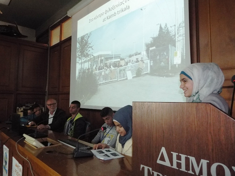 Ιδιαίτερης σημασίας ήταν η παρουσίαση στα ελληνικά, ενός σχεδίου της Δομής Υποδοχής Προσφύγων, δηλαδή των προσφύγων μαθητών Γυμνασίου, που φοιτούν σε τάξεις υποδοχής στο 2ο Γυμνάσιο Τρικάλων. Στην ελληνική γλώσσα οι μαθητές και οι μαθήτριες παρουσίασαν μια μικρή αναδρομή του μεγάλου τους ταξιδιού από τη Συρία στη χώρα μας και στο κέντρο φιλοξενίας στα Τρίκαλα. Και καταχειροκροτήθηκαν.