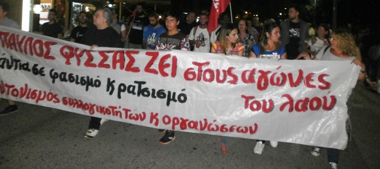 Καλούμε κάθε σωματείο εργαζομένων, συνδικάτο, μαθητική κοινότητα, φοιτητικό σύλλογο, συλλόγους γονέων και κηδεμόνων, κοινωνικά κινήματα, μετωπικά σχήματα, στέκια, συλλογικότητες, συνδικαλιστικές παρατάξεις, πολιτικές οργανώσεις, να πάρουν αγωνιστικές αποφάσεις για τη διοργάνωση μιας μαζικής, μαχητικής συγκέντρωσης και πορείας, την Τρίτη 18 Σεπτέμβρη, ημέρα συμπλήρωσης 5 χρόνων από τη δολοφονία του Παύλου Φύσσα.