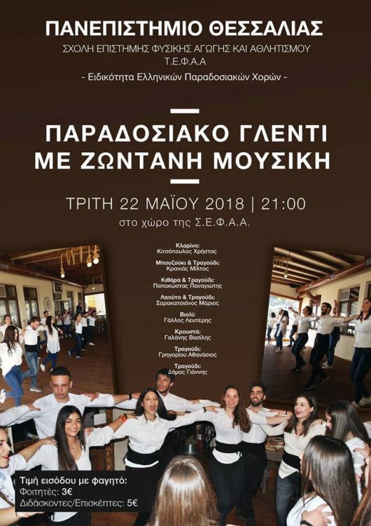 Σήμερα το βράδυ (Τρίτη 22 Μαΐου) ώρα 21.00 οι φοιτητές της ειδικότητας Ελληνικοί Παραδοσιακοί Χοροί διοργανώνουν με την υποστήριξη του πανεπιστημιακού τους δασκάλου κ. Γιάννη Δήμα την ετήσια μουσικοχορευτική εκδήλωση, Ελληνικό γλέντι με ζωντανή μουσική σε παραδοσιακό και λαϊκό πρόγραμμα. Η εκδήλωση θα πραγματοποιηθεί στον αύλιο χώρο του ΤΕΦΑΑ σε ειδικά διαμορφωμένο και σκεπασμένο χώρο 500 τετραγωνικών μέτρων. Η διοργάνωση γίνεται στα πλαίσια της πρακτικής άσκησης των φοιτητών με θέμα διοργάνωση μεγάλων πολιτιστικών εκδηλώσεων. Χορός-Διασκέδαση-Εκπαίδευση.