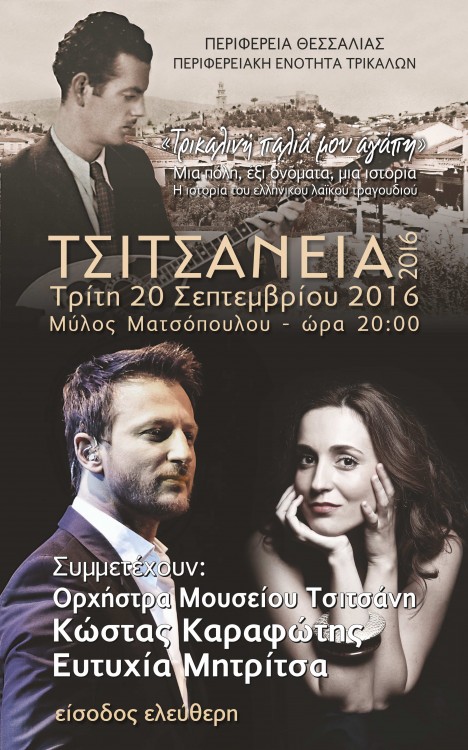 Η Περιφερειακή Ενότητα Τρικάλων της Περιφέρειας Θεσσαλίας διοργανώνει την αναβληθείσα κεντρική εκδήλωση των «Τσιτσανείων 2016» αυτή  την Τρίτη 20 Σεπτεμβρίου 2016 και ώρα 20:00 στον Μύλο  Ματσόπουλου.
