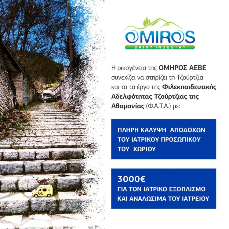 «Η οικογένεια Γιαννίτση συνεχίζει να υποστηρίζει το χωριό της Τζούρτζιας και την Φιλεκπαιδευτική Αδελφότητα Τζούρτζιας της Aθαμανίαs (Φ.Α.Τ.Α.). Μετά από την δωρεά ενός απινιδωτή στο ιατρείο της Τζούρτζιας που πραγματοποιήθηκε τον Φεβρουάριο, η ΟΜΗΡΟΣ ΑΕΒΕ κατόπιν συνεννόησης με την πρόεδρο της Φ.Α.Τ.Α. κ. Ελένη Ράπτη, καλύπτει τα έξοδα για τον εξοπλισμό και εκσυγχρονισμό του ιατρείου διαθέτοντας 3000 ευρώ. Επιπλέον εξασφαλίζει την παρουσία ιατρού καλύπτοντας την αμοιβή του. Ευχόμαστε σε όλους καλό και ασφαλές καλοκαίρι»! τονίζεται σε ανακοίνωση.