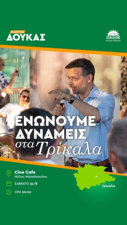 Ο Χάρης Δούκας, υποψήφιος πρόεδρος του ΠΑΣΟΚ-Κινήματος Αλλαγής, στο πλαίσιο της περιοδείας του, θα βρίσκεται στα Τρίκαλα, το Σάββατο 31 Αυγούστου 2024 και θα μιλήσει στις 20.00 στο Cine Cafe (Μύλος Ματσόπουλου) .