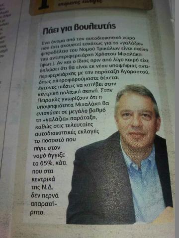 Φωτιές ανάβει σημερινό δημοσίευμα της εφημερίδας «Παραπολιτικά», που θέλει τον αντιπεριφερειάρχη Τρικάλων Χρήστο Μιχαλάκη να… «Πάει για βουλευτής».