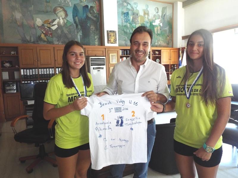 Θάλασσα δεν έχουμε – ακόμη – στα Τρίκαλα, έχουμε όμως πρωταθλήτρια του beach volley! Η τρικαλινή Ευαγγελία Παπαθεοδώρου, με τη βολιώτισσα Αναστασία Φιλιππίδη, πήραν το χάλκινο μετάλλιο στο πανελλήνιο πρωτάθλημα beach volley κορασίδων. Αυτό, διεξήχθη το διάστημα 30 και 31 Ιουλίου 2016 στις εγκαταστάσεις στον Σχοινιά της Αττικής. Στους αγώνες, το δίδυμο των κοριτσιών πήρε επάξια την τρίτη θέση, με την εμπειρία που έχουν και ως παίκτριες ομάδων βόλεϊ (στον ΑΣ Ασκληπιός Τρικάλων η Ευαγγελία, στην Αργώ Μαγνησία η Αναστασία). Σήμερα το πρωί, με τα μετάλλια στο στήθος, επισκέφθηκαν τον Δήμαρχο Τρικκαίων κ. Δημήτρη Παπαστεργίου. Ο οποίος συνεχάρη τα δύο κορίτσια για την επιτυχία τους, έχοντας φυσικά πολλά να ρωτήσει για το ίδιο το άθλημα, ενώ αποδέχθηκε με χαρά ‘ένα μπλουζάκι υπογεγραμμένο από τις δύο αθλήτριες. Ευχήθηκε, βεβαίως, καλή συνέχεια και περισσότερες επιτυχίες, αλλά το καλύτερο το επεφύλασσε για το τέλος. Στις άμεσες προθέσεις του Δήμου Τρικκαίων είναι η δημιουργία ενός χώρου για το θεαματικό αυτό άθλημα, στην πισίνα του πάρκου Αη Γιώργη. Οι σχετικές διαδικασίες δεν είναι χρονοβόρες και, σε συνδυασμό με τα όσα ήδη ετοιμάζονται για τον χώρο, αναμένεται σύντομα να δημιουργηθεί χώρος προπόνησης και αγώνων για το συγκεκριμένο άθλημα.