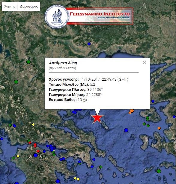 Ισχυρή σεισμική δόνηση μεγέθους 5,2 βαθμών της κλίμακας Ρίχτερ σημειώθηκε στη 1:49 τα ξημερώματα στη θαλάσσια περιοχή μεταξύ Σκύρου και Αλλονήσου. Σύμφωνα με την προκαταρκτική ανάλυση του Γεωδυναμικού Ινστιτούτου το εστιακό βάθος εντοπίζεται στα 10 χλμ. Η σεισμική δόνηση έγινε αντιληπτή σε ολόκληρη σχεδόν τη Θεσσαλία.