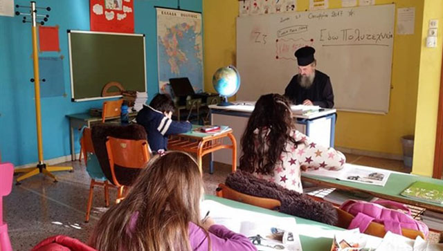 Ελλείψει δασκάλου λοιπόν και στην αίθουσα μπήκε ο παππάς! Ο ιερέας του χωριού που τυγχάνει και γονιός ενός από τους τρεις μαθητές.