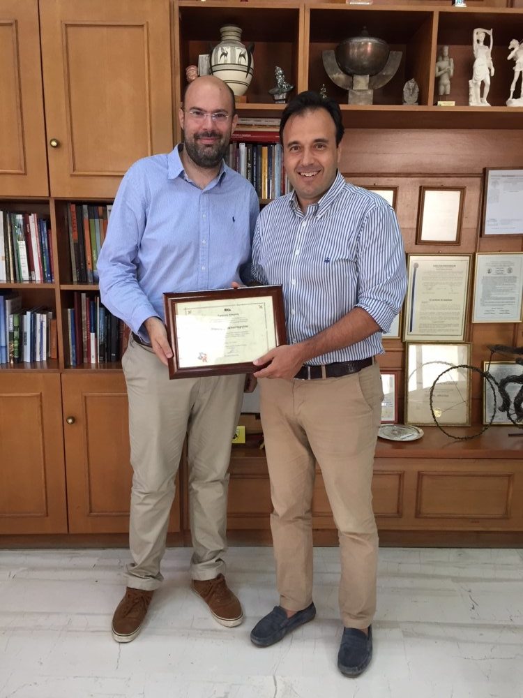 Με βράβευση και τιμητική διάκριση για την πρωτοπόρα και καινοτόμα δράση του Δήμαρχου Τρικκαίων, επισκέφθηκε τα Τρίκαλα ο πρόεδρος της Ενωσης Νέων Αυτοδιοικητικών (Ε.Ν.Α.) Ελλάδας κ. Νεκτάριος Καλαντζής. Ο δημοτικός σύμβουλος Παλλήνης απένειμε στον Δήμαρχο Τρικκαίων κ. Δημήτρη Παπαστεργίου αναμνηστικό δίπλωμα «για τη μεγάλη του προσφορά στην Τοπική Αυτοδιοίκηση ως τον πιο πρωτοπόρο και καινοτόμο Δήμαρχο». Επίσης, ο κ. Καλαντζής ανακοίνωσε στον Δήμαρχο Τρικκαίων ότι η ΕΝΑ τον ανακήρυξε επίτιμο μέλος της. Ο πρόεδρος της ΕΝΑ επισκέφθηκε το Δημαρχείο Τρικκαίων και συνομίλησε με τον κ. Παπαστεργίου για τα ζητήματα της αυτοδιοίκησης, σε σχέση με τις καινοτόμες δράσεις του Δήμου σε όλα τα επίπεδα. Επίσης, έγινε ιδιαίτερη συζήτηση και για το θέμα της τεχνολογίας, με τον Δήμαρχο Τρικκαίων να ξεναγεί τον νέο σε ηλικία δημοτικό σύμβουλο, στο Smart Trikala. Εξάλλου, οι σύγχρονες τεχνολογίες είναι ένας από τους τομείς, στους οποίους τα τελευταία τρία χρόνια η ΕΝΑ προσδίδει ιδιαίτερη σημασία και βαρύτητα, με τη διοργάνωση ημερίδων και διαφορετικών κάθε φορά εκδηλώσεων.