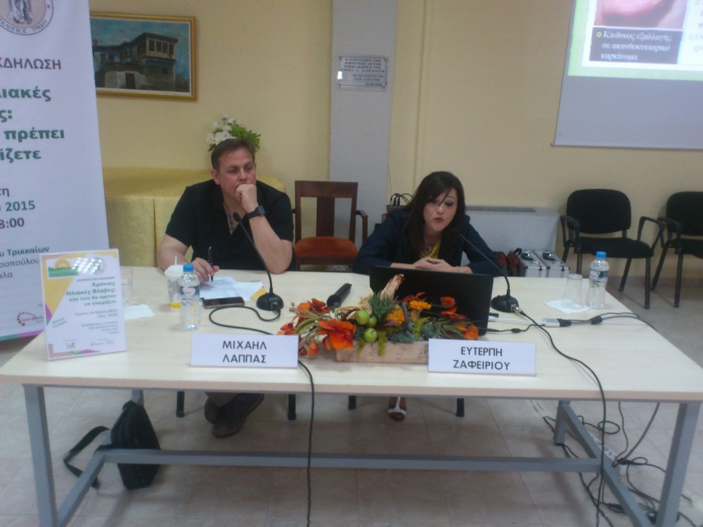 Ενημερωτική εκδήλωση με θέμα τις ‘’Χρόνιες Ηλιακές βλάβες’’ πραγματοποιήθηκε το απόγευμα της Πέμπτης στο Ε΄ ΚΑΠΗ Τρικάλων. Τη διοργάνωση της εκδήλωσης ανέλαβε ο Δήμος Τρικκαίων και το Εθνικό Διαδημοτικό Δίκτυο Υγιών Πόλεων-Προαγωγής Υγείας και αφορούσε όλα όσα θα πρέπει να γνωρίζουμε για τις χρόνιες βλάβες που μπορεί να κληθούμε να αντιμετωπίσουμε από τη μακροχρόνια και συνεχή έκθεση στις υπεριώδεις ακτίνες του ήλιου. Συντονιστής της εκδήλωσης ήταν ο Εντεταλμένος Σύμβουλος Εθελοντισμού και υπεύθυνος για θέματα Υγείας του Δήμου Τρικκαίων ο κ. Μιχαήλ Λάππας, ενώ ομιλήτρια ήταν η κα. Ευτέρπη Ζαφειρίου, Επίκουρη Καθηγήτρια Δερματολογίας του Πανεπιστημίου Θεσσαλίας. Ήταν μία πολύ ενδιαφέρουσα ομιλία που άφησε ευχαριστημένους όλους τους παρευρισκομένους οι οποίοι ενημερώθηκαν για όλα αυτά που πρέπει να γνωρίζουμε για ένα θέμα, που χρήζει ιδιαίτερης προσοχής ιδιαίτερα τους καλοκαιρινούς μήνες.